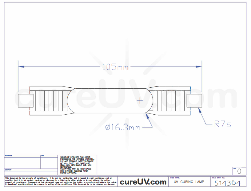 La lámpara de curado tiene una longitud total de 105 mm y un diámetro de tubo de 16,3 mm y se considera uno de los emisores de UV altamente efectivos y de alta calidad del mercado. La lámpara funciona bien para secar y curar tintas y revestimientos en letreros y gráficos. La lámpara está llena de halogenuros metálicos de hierro y contiene una placa de cuarzo que evita que caigan residuos sobre la lámpara al actuar como relleno entre la lámpara y el sistema de curado.