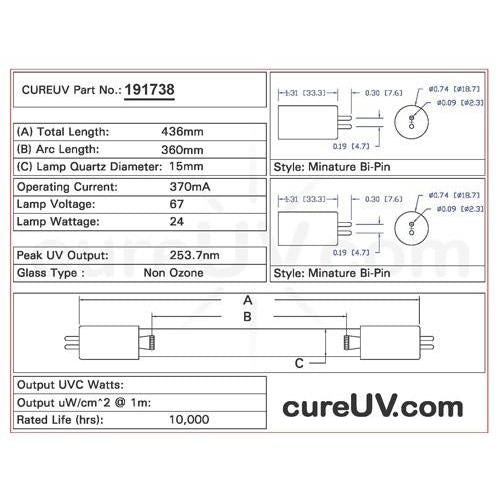 Notre ampoule UVC de remplacement Atlantic Ultraviolet 05-1097-R est une ampoule miniature de traitement de l'eau à deux broches et à double extrémité qui a une longueur totale de 17,17". L'ampoule de traitement de l'eau de 24 watts a un matériau de base en céramique et peut durer jusqu'à 10 000 heures. L'ampoule UVC de remplacement est complète avec les modèles suivants et leurs numéros de pièce :