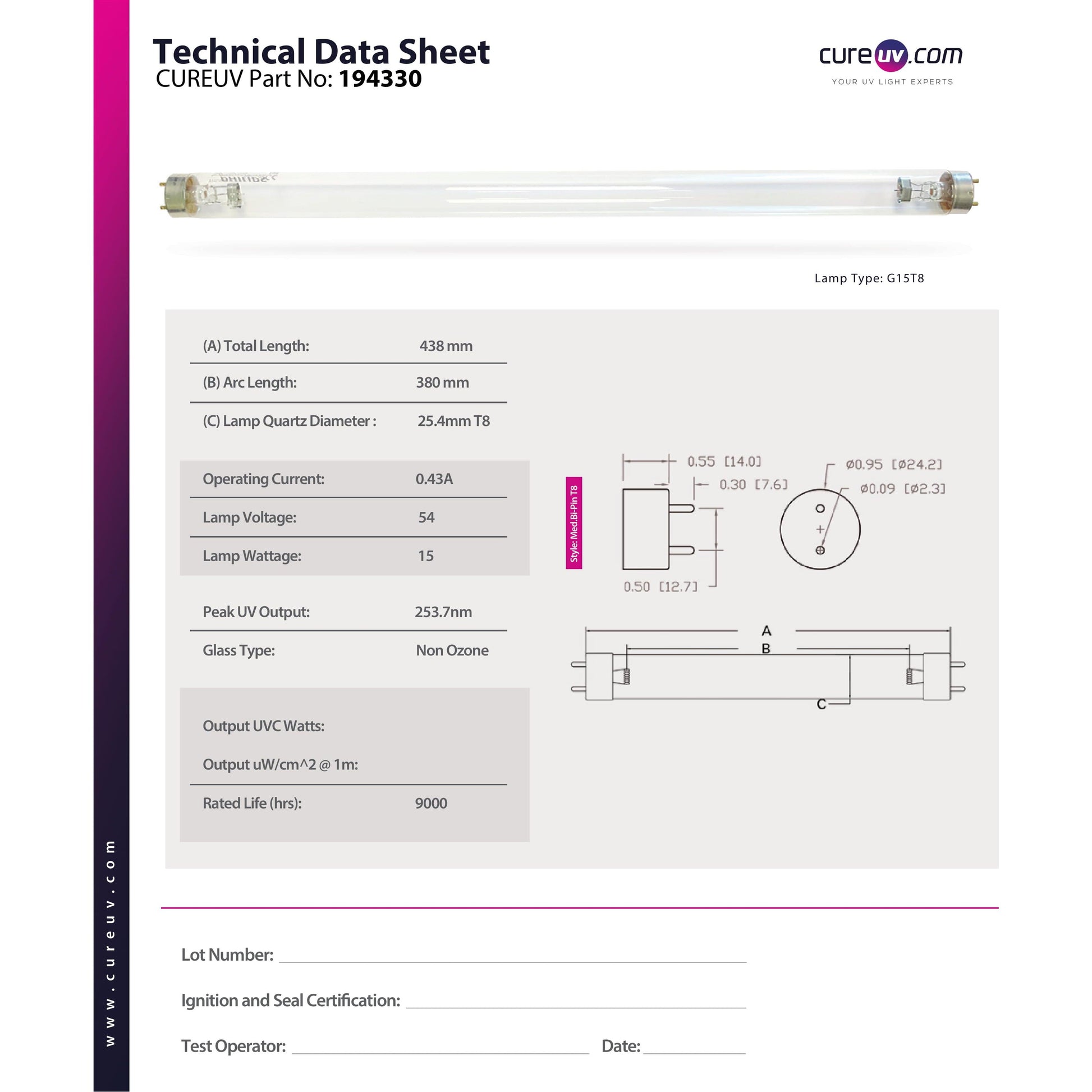 • Lamp Quartz Diameter: 25.4mm T8