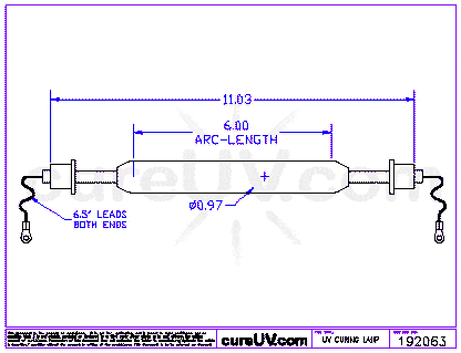 Our CureUV generic replacement for the American Ultraviolet Part # A9461MCB-SE UV Curing Lamp Bulb is a 100% compatible replacement lamp bulb that has an arc length of 6 inches and a total length of 11.03 inches. The lamp bulb has 6.5 inch leads on both the ends and an output power of 300 WPI. The UV lamp exceeds OEM standards of UV curing bulb performance. The curing lamp bulb is compatible to the following part numbers: