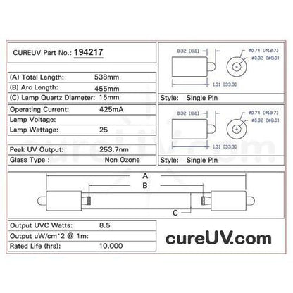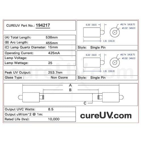 Drawing of Replacement UVC Bulb Item # 194217 (PDF)Spectral Output of Germicidal UVC Light Bulbs (PDF)