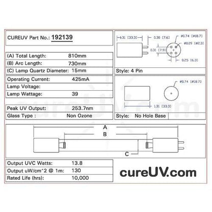 Our Aqua Treatment Service ATS4-810 Replacement UVC Light Bulb is a 39 Watt, 4 pins on a single end water treatment bulb that is a compatible replacement for the following germicidal UV-C models: