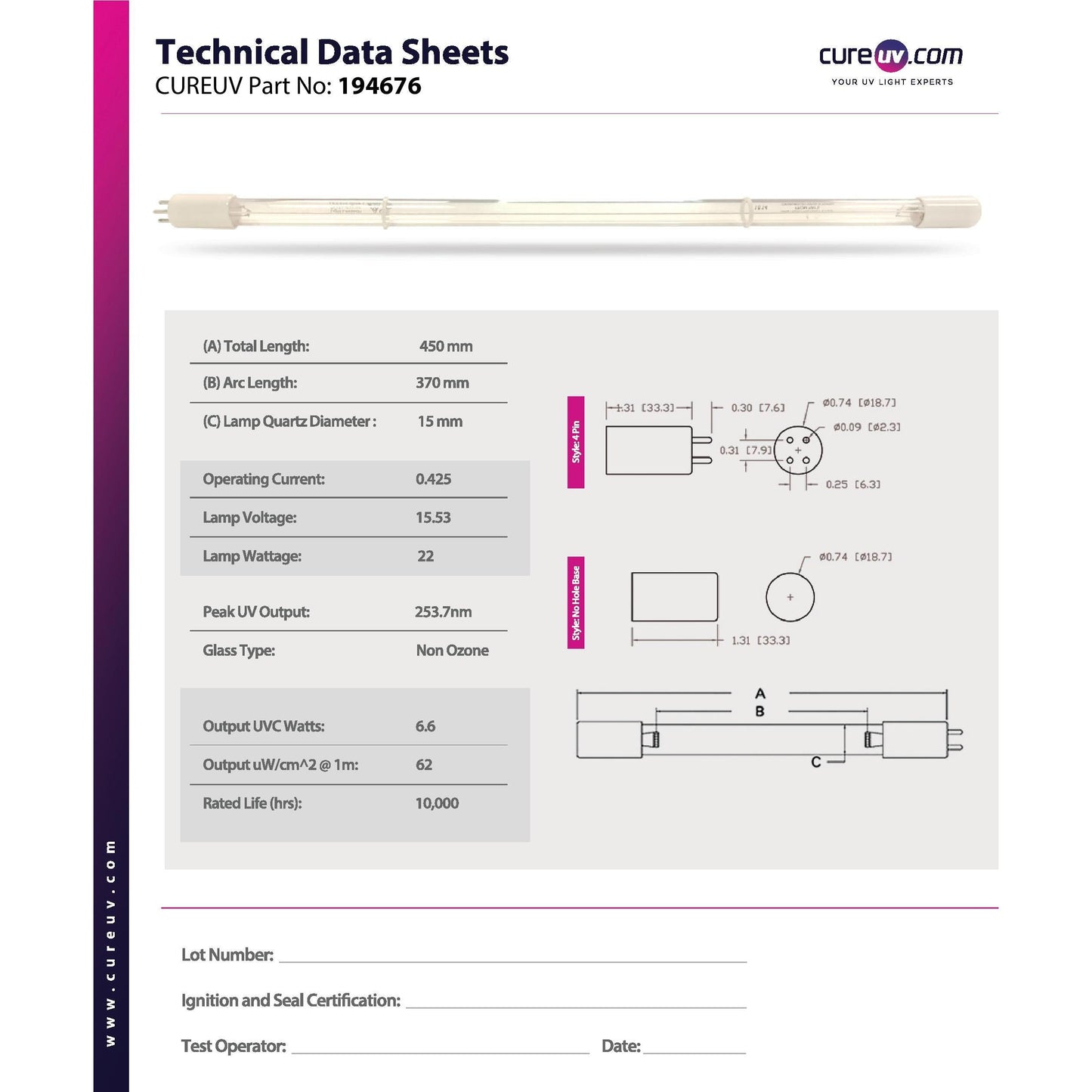 Our Master Water Conditioning GPH450T5VH/4 Replacement UVC Light Bulb is a four pin on a single end germicidal water treatment bulb that has lamp wattage of 22 Watts. The UVC lamp bulb has a total length of 17.72" and an arc length of 14.57". The UVC light bulb has lamp wattage of 22Watts and a peak output of 253.7nm. It has a base material of ceramic and a rated life of 10,000 hours. It is recommended to replace the light bulb after its stipulated time for better efficiency of the system. The UVC bulb is compatible for use with the following germicidal system models:
