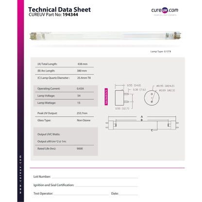 The Purely UV PUVLB515 Air/Water Treatment Germicidal UV Light Bulb comes with a G13 medium bi-pin base and has an average lifespan of 10,000 hours. The 15 Watts lamp is completely compatible with the following model: